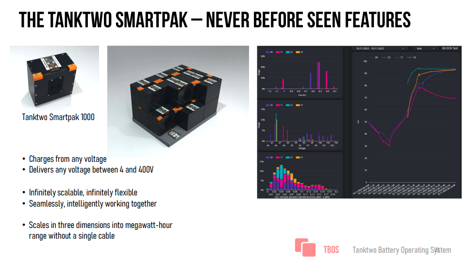 The above image is the Tanktwo Smartpak, a modular system that works like Lego — you can stack blocks to build a battery pack of any shape or form and almost any capacity without any cable or wiring. Plus, the system is extraordinarily resilient against failure — it still functions perfectly even if cells, blocks, or entire rows cease to function.